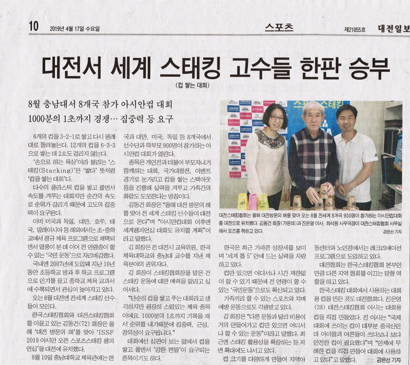 대전일보에 2019.8. 10.대전 충남대학교에서 열리는 ISSF 2019 아시안 오픈 스포츠스태킹 챔피언십 대회 및 한국스포츠스태킹협회 회장님 인터뷰가 실렸습니다.